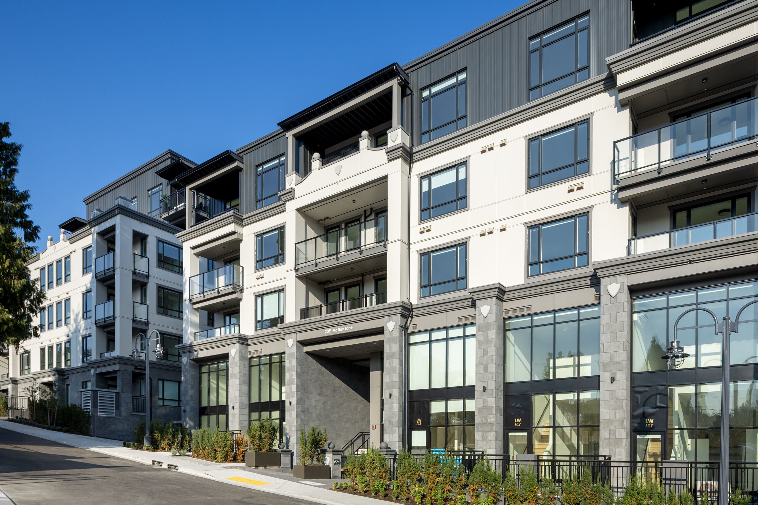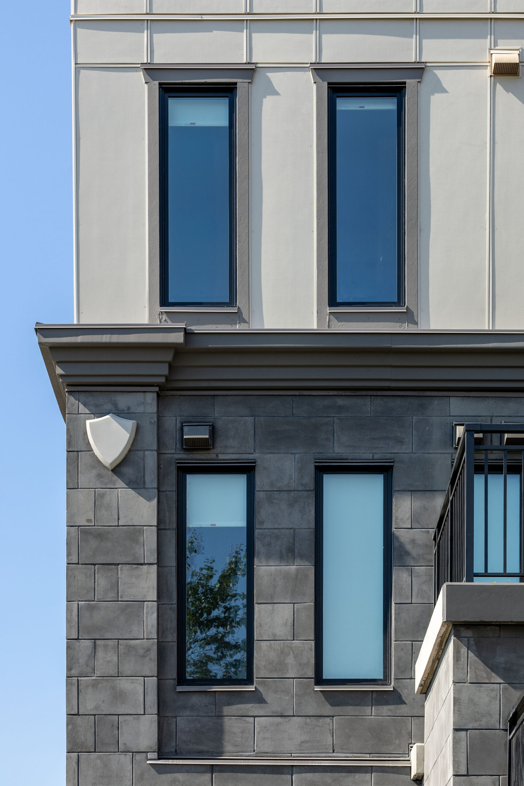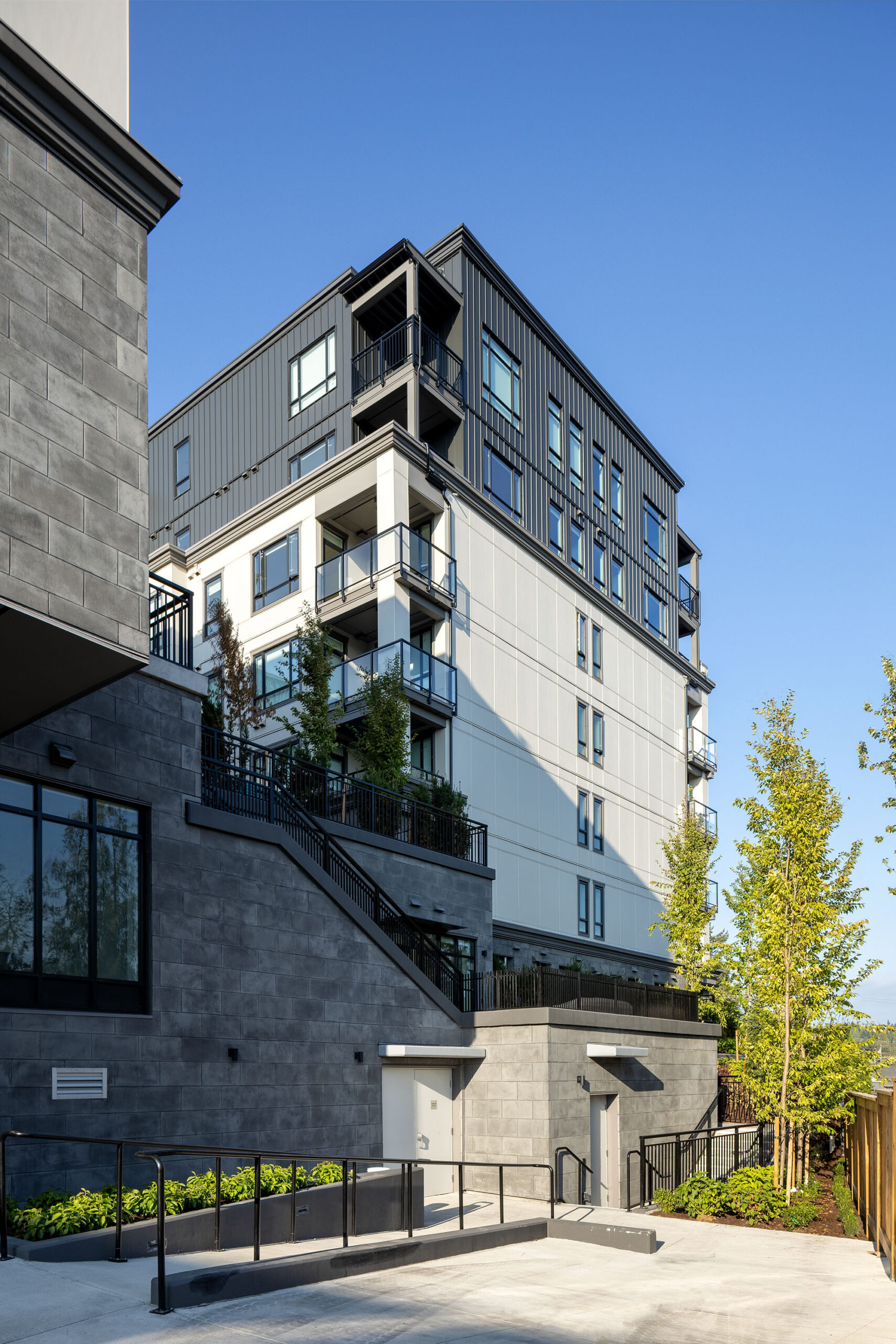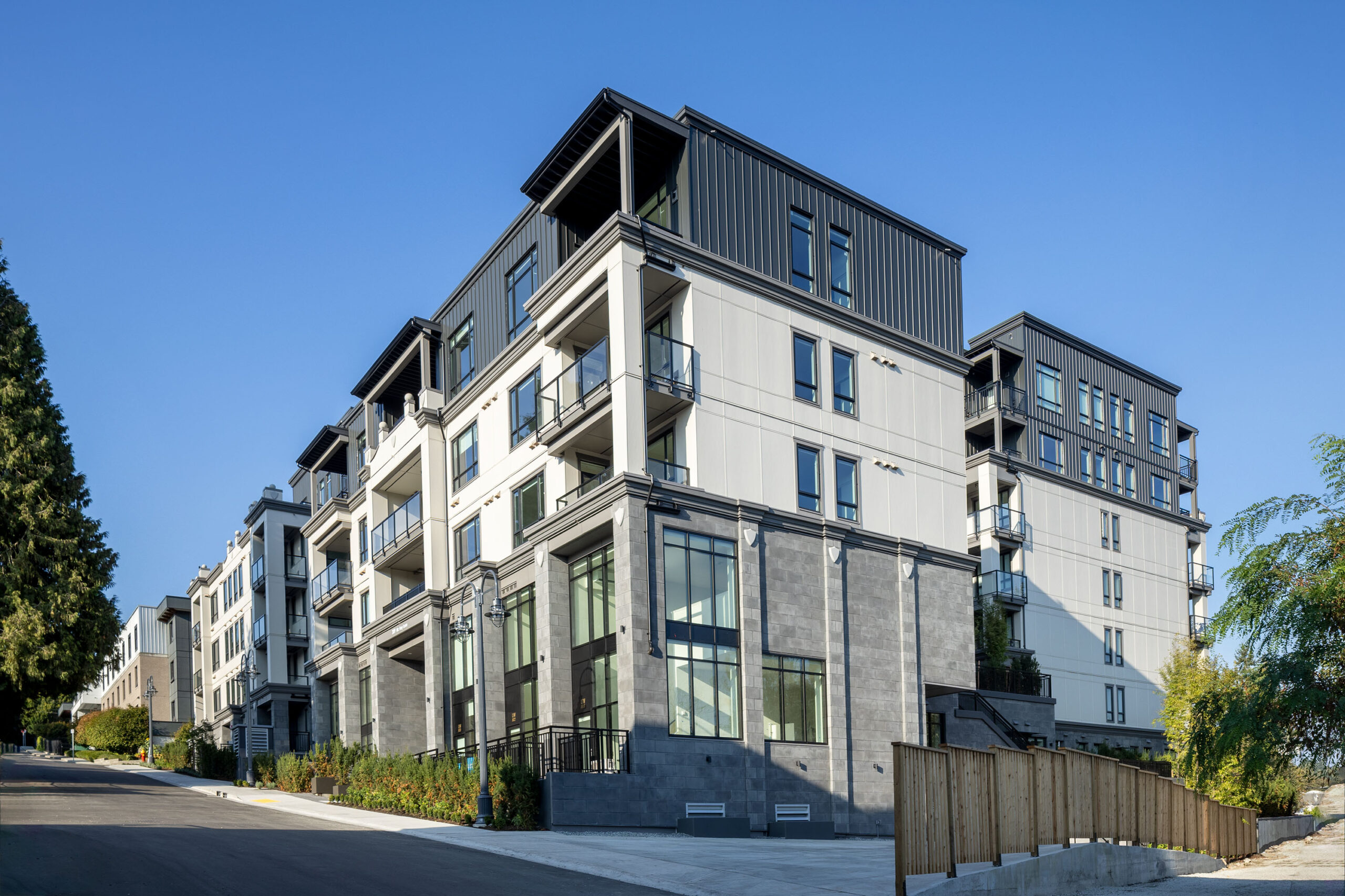Inspired by French heritage architecture, this condo building features stone accents, varied balconies, stepped-back upper levels, and long vertical windows that emphasize height, light, and elegant proportions.