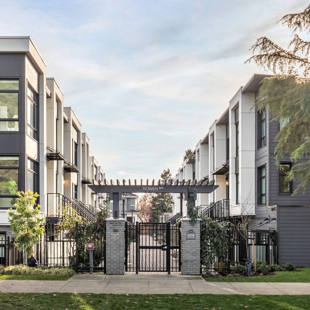 This collection of 36 stacked townhomes is located in Vancouver’s Oakridge neighbourhood. Four contemporary buildings are arranged around a central courtyard, with three-storey forms addressing the street and stepped two-and-a-half-storey volumes along the lane.